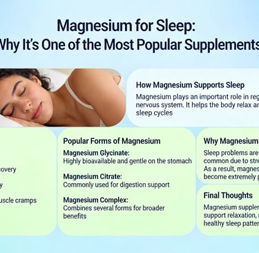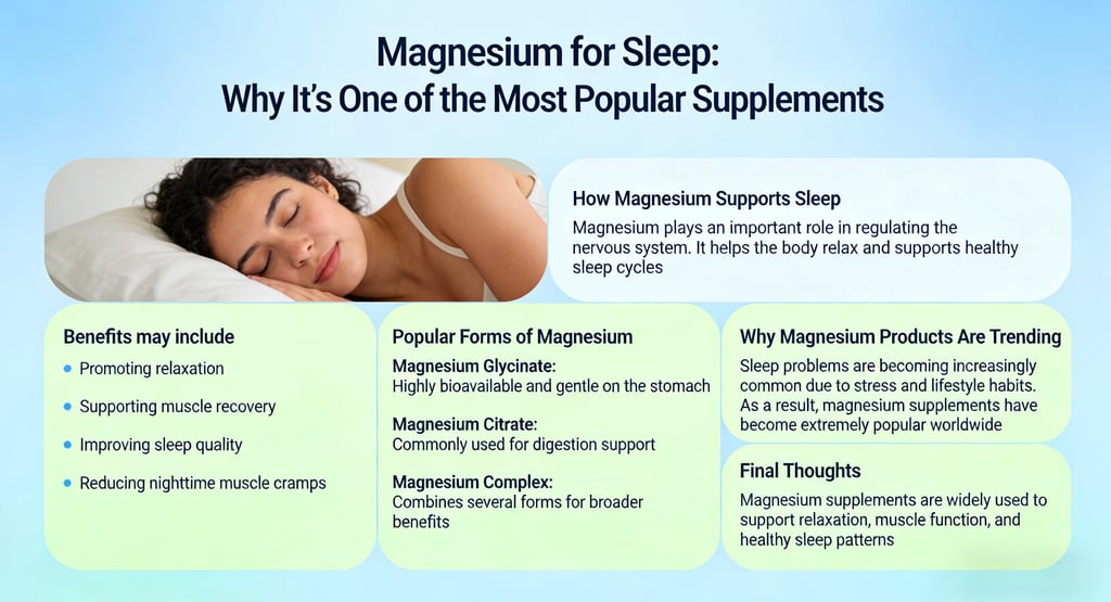Magnesium supplements are widely used to support relaxation, muscle function, and healthy sleep patterns.