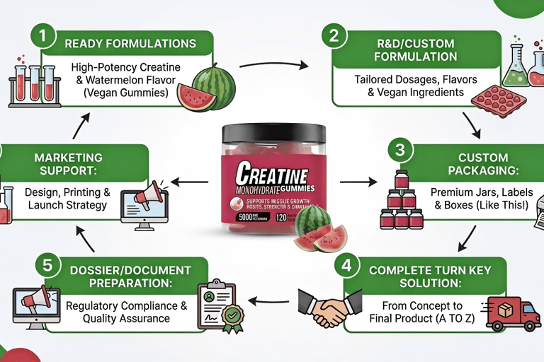 Flexible Formulas: Vitamins, Creatine(Creapure® ) gummy, Collagen, etc. Customize sweetness (sugar-free/low-sugar), vegan/gel-free, gluten-free.